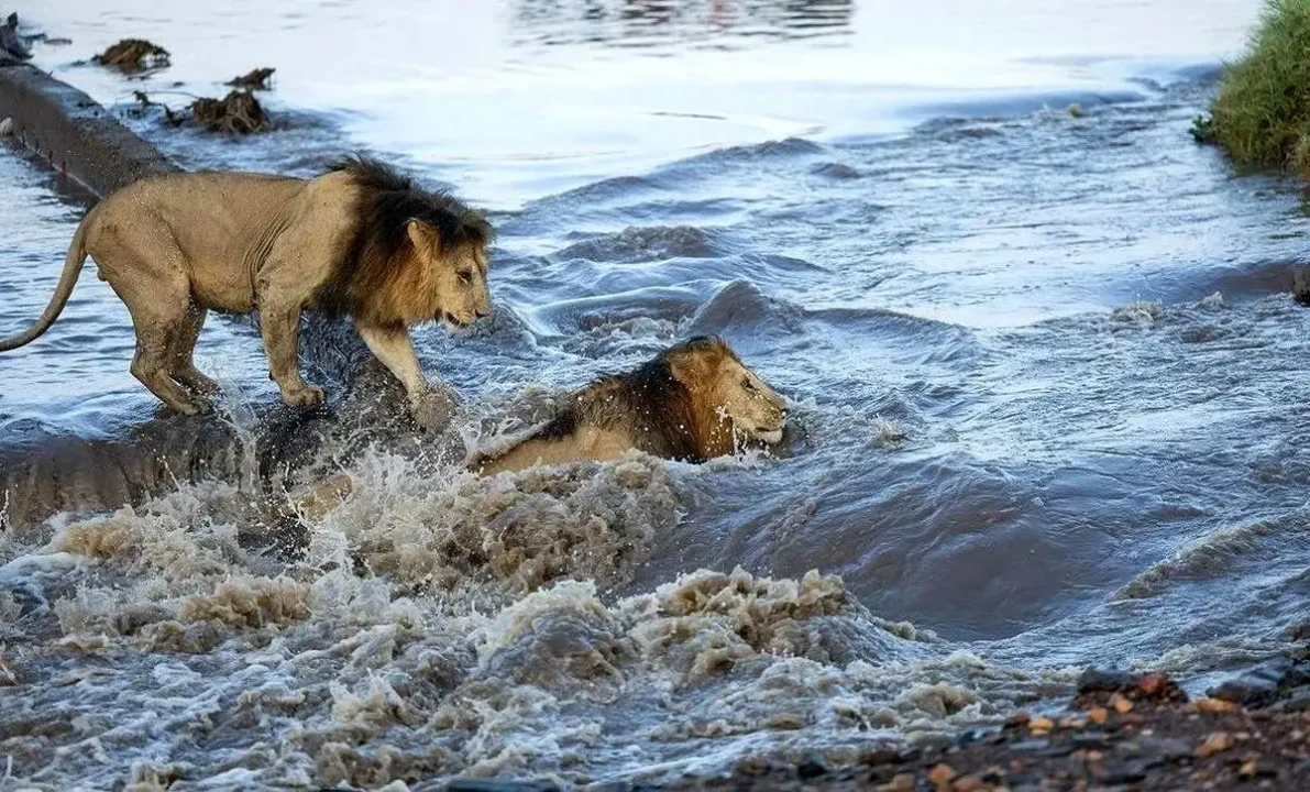 در این ویدئو سه شیر نر را می بینید که قصد عبور از یک رودخانه خروشان را دارند؛ شیر اول و دوم به سختی موفق میشوند، اما شیر سوم وارد آب نمیشود. این صحنه های جالب در پارک ملی کروگر در آفریقای جنوبی ضبط شده است.